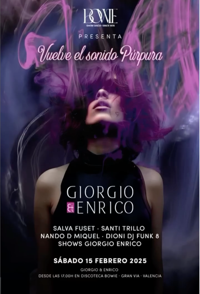 La leyenda regresa con una noche muy especial en Bowie, donde reviviremos el inconfundible sonido púrpura que convirtió a Giorgio & Enrico en un icono del ocio valenciano. Una experiencia diseñada para quienes buscan elegancia, emoción y recuerdos imborrables en la pista de baile.